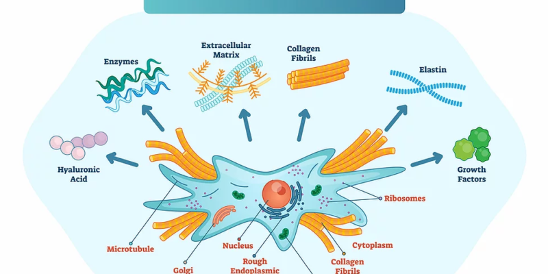 Fibroblasty w procesie neosyntezy kolagenu, wydzielają do macierzy zewnątrzkomórkowej tropokolagen typu I. Tropokolagen typu I, w postaci potrójnej helisy, jest prekursorem dojrzałego kolagenu. Dojrzałe włókna kolagenu w macierzy zewnątrzkomórkowej, tworzą charakterystyczny układ przestrzennej siatki – biorusztowanie, które odpowiada za integralność strukturalną, sprężystości tkanek oraz wytrzymałość na rozciąganie.